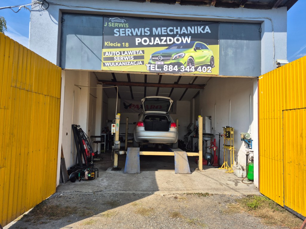 Widok zewnętrzny serwisu mechaniki pojazdowej w Kleciach, oferującego kompleksowe usługi dla pojazdów.